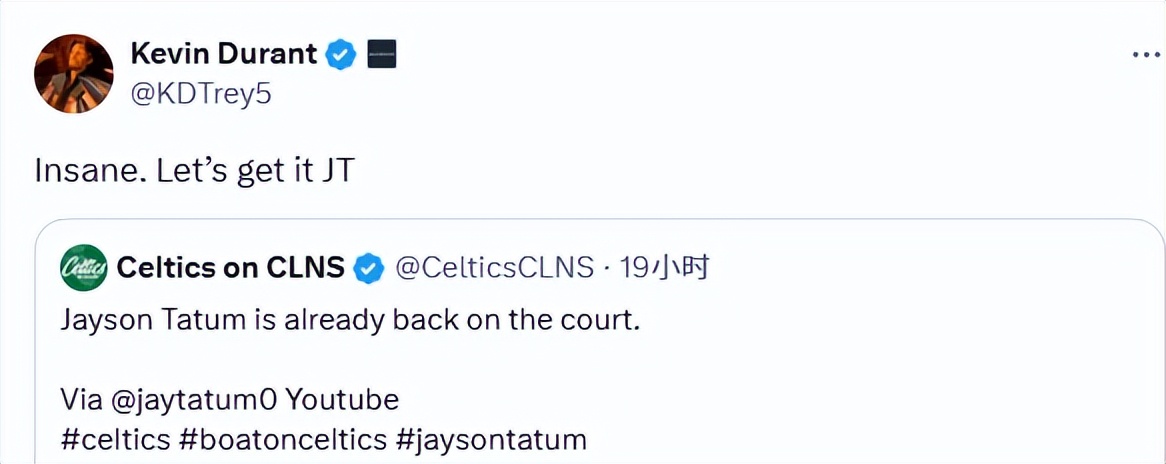 Durant was clearly amazed by Tatum’s recovery speed; he reposted and responded, “That’s crazy, keep it up, JT (Tatum)!”
