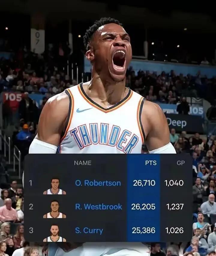 It’s worth mentioning,Westbrook currently has a total of 26,205 points in his NBA career, ranking 20th all-time in the league and second among point guards, trailing only Oscar Robertson by 505 points (Robertson has 26,710).