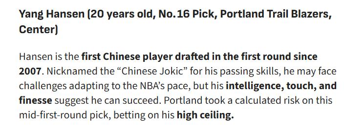 Han-Sen is the first Chinese player drafted in the first round since 2007. Known for his excellent passing, he has been dubbed the “Chinese Jokic.” Although he may face challenges adapting to the NBA pace, his basketball IQ, touch, and skills indicate he can establish himself in the league. The Trail Blazers’ mid-first-round selection of him is a carefully considered gamble on his high ceiling.