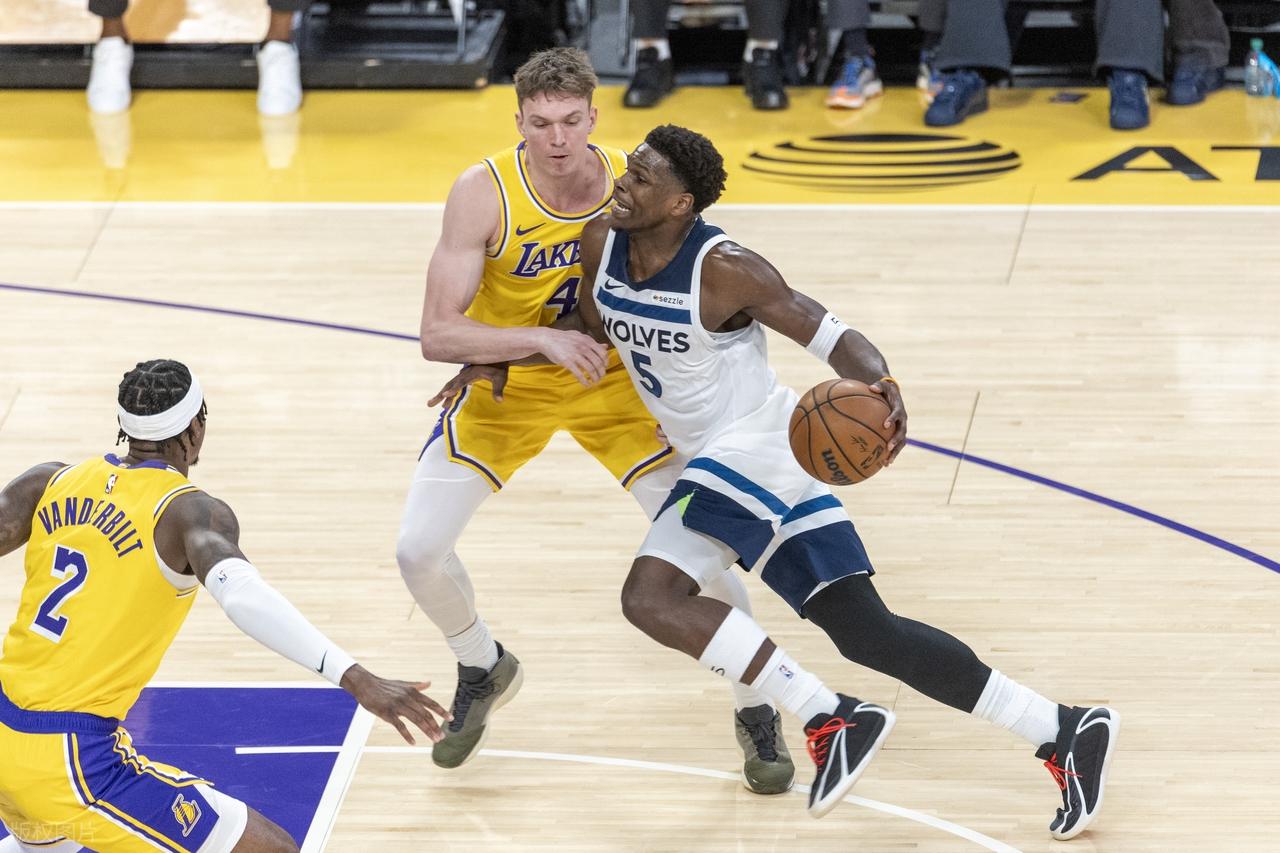 In the first quarter, DiVincenzo made a floater, McDaniels scored on consecutive plays, and Randle hit an open three-pointer, giving the Timberwolves an early 9-2 lead. Doncic stepped up to score, while Hachimura and Vincent hit back-to-back threes, bringing the Lakers close at 13-16. DiVincenzo nailed a long-range shot, Edwards finished a fast break layup, Randle hit a fadeaway jumper, and Edwards scored again on consecutive plays; Doncic and Reeves responded with successive baskets, LalaVía sank a three-pointer, and Doncic scored 8 straight points driving inside and shooting outside, with the Timberwolves leading 34-30. Reed and Edwards made consecutive threes to help the Timberwolves close the quarter ahead 40-36.