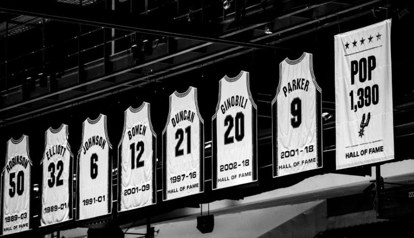 This commemorative banner hangs alongside the retired jerseys of David Robinson (#50), Sean Elliott (#32), Avery Johnson (#6), Bruce Bowen (#12), Tim Duncan (#21), Manu Ginobili (#20), and Tony Parker (#9) in the arena.