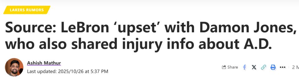 On October 27th Beijing time, sources revealed to Lakers Daily that Lakers superstar LeBron James is “unhappy” about his friend Damon Jones leaking private details of his participation status to gamblers.