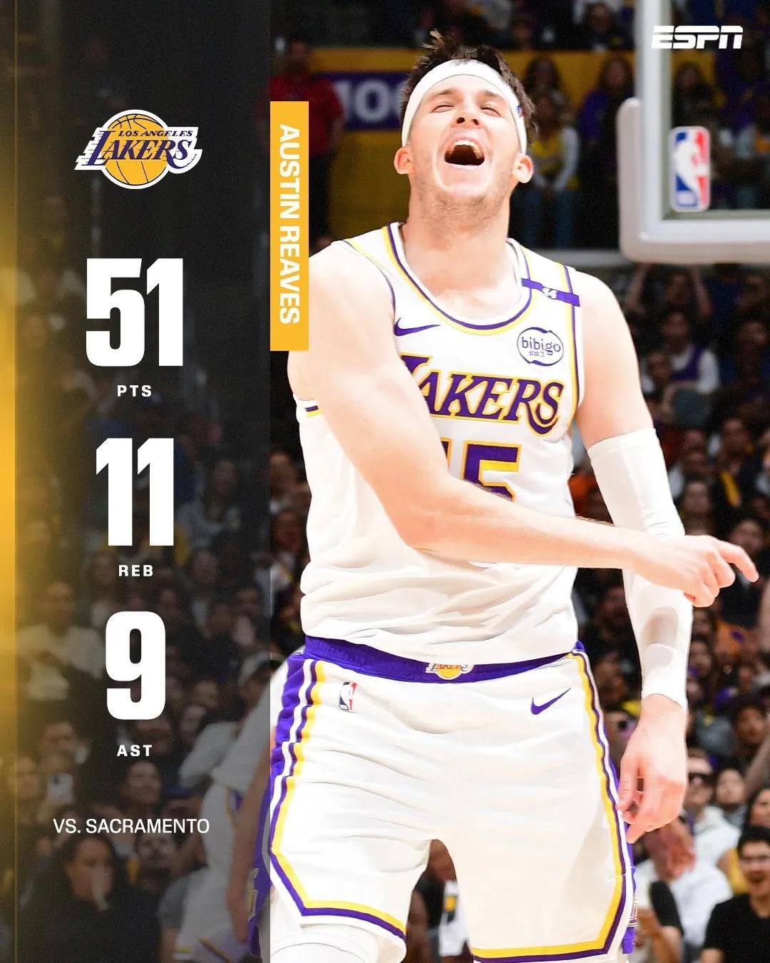 Reeves, leading the team alone, made 12 out of 22 shots, including 6 out of 10 from beyond the arc, and converted 21 of 22 free throws to rack up 51 points, 11 rebounds, and 9 assists, with a +22 rating, helping the Lakers beat the Kings 127-120.