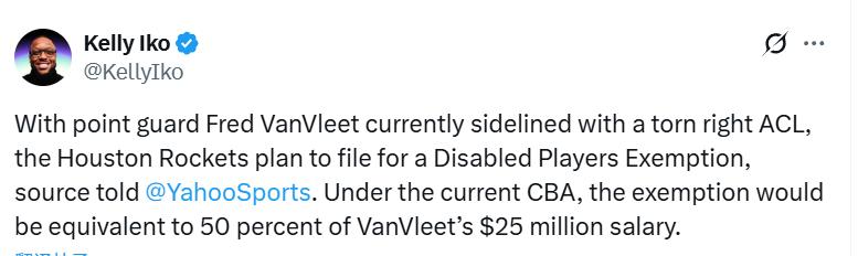 The Rockets plan to apply for a hardship exception! The amount could reach $12.5 million, and VanVleet is expected to miss the season.