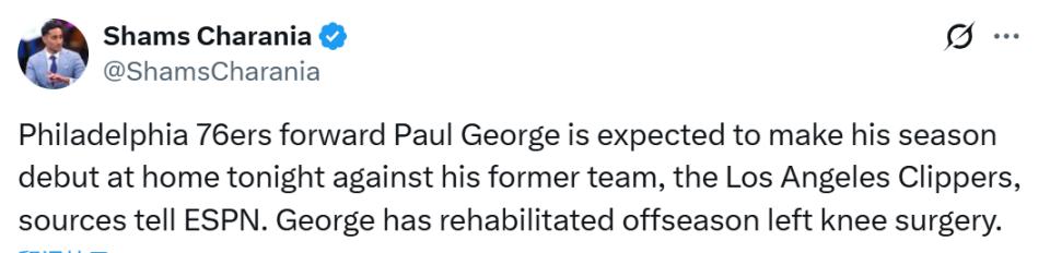 On November 18th Beijing time, reporter Shams revealed that Paul George will make his official comeback in today’s game versus the Clippers, completing his personal season debut.