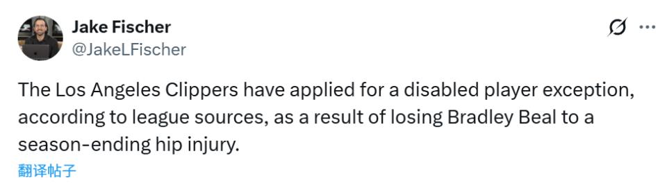 On November 22nd Beijing time, as reported by Jake Fischer, the Los Angeles Clippers have filed for an injury exception due to Bradley Beal’s season-ending hip injury.