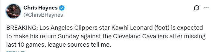 According to Chris Haynes on November 23rd Beijing time, Clippers forward Kawhi Leonard is expected to return in Monday’s matchup against the Cleveland Cavaliers.