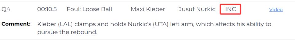 The first missed call occurred with 10.5 seconds remaining, when Lakers player Kleber trapped and held the left arm of Jazz player Nurkic, affecting his ability to contest the rebound. This was an uncalled rebounding foul, benefiting the Lakers and harming the Jazz.