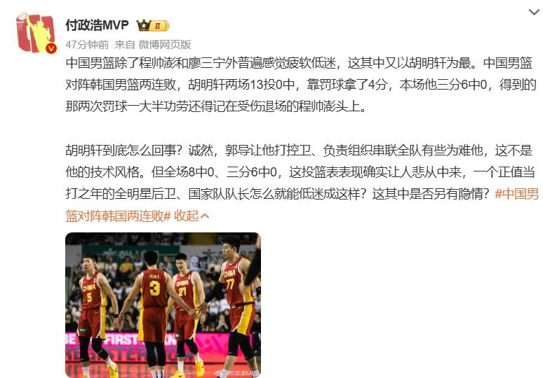 Altogether, he took 19 shots without making a single field goal—this is how Hu Mingxuan has performed in his last three matches against the Korean team...