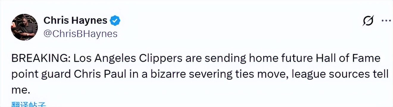 Just minutes ago, Paul posted on social media: "I was just informed that I’m being sent home." Reporter Haynes reported that, according to league sources, the Los Angeles Clippers are unexpectedly parting ways with future Hall of Fame point guard Chris Paul.