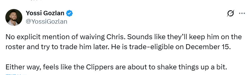 Salary expert Gozlan pointed out that the Clippers' statement about this shocking news did not explicitly say they waived Chris. "The statement didn’t clearly say they waived Chris; it sounds like they plan to keep him on the roster first and then try to trade him later. He can be traded starting December 16th. Either way, the Clippers are gearing up for some major changes."