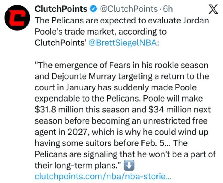 Recently, reporter Siegel reported thatWith the rise of this year’s 7th overall pick Fels and Murray’s expected return in January, Poole’s role on the Pelicans has suddenly become marginal. He has been put on the trade block to assess his value and is no longer considered part of the team’s long-term plans.
