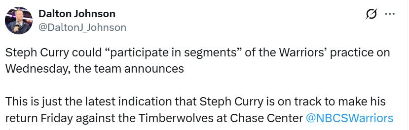 Reporter Dalton Johnson shared the Warriors' announcement and noted this further indicates Curry is likely to return for the home game against the Timberwolves this Saturday.