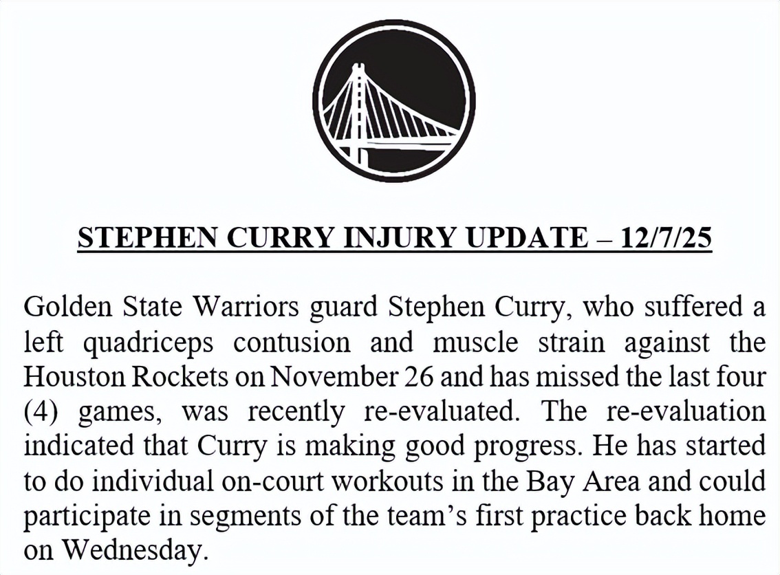 The official announcement states: Golden State Warriors guard Stephen Curry sustained a left quadriceps contusion and muscle strain in the November 27th game (Beijing time) against the Houston Rockets, causing him to miss 4 games since. The team recently re-evaluated his injury, showing good recovery progress. He has started individual on-court training in the Bay Area and is expected to join parts of the practice when the team returns home on Thursday.