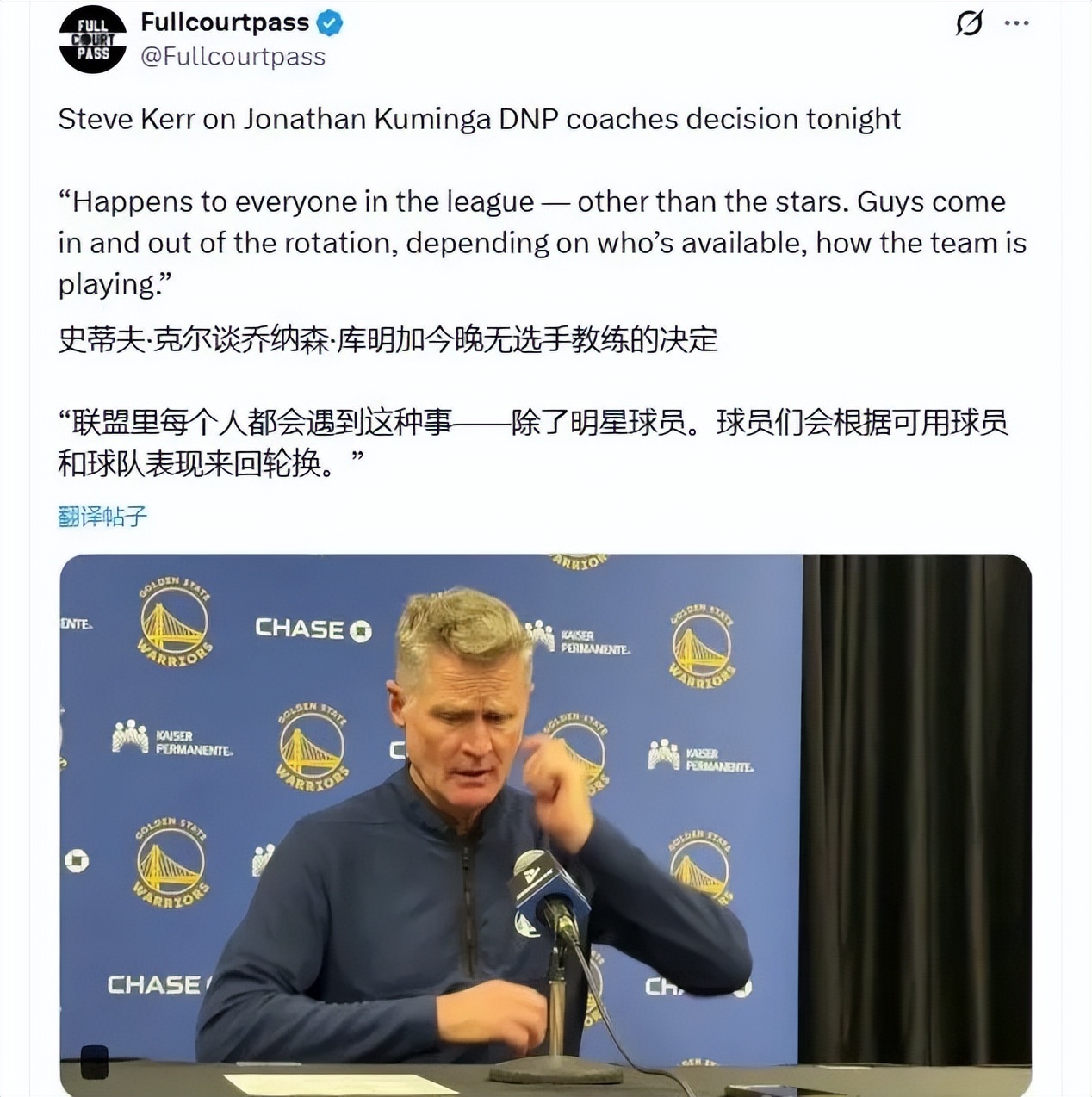 After the game, Warriors coach Kerr discussed the reason behind Kuminga’s DNP status, explaining that this is the nature of the NBA—someone is always striving to take your job.