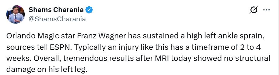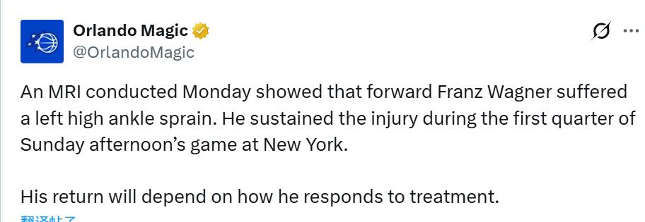 On December 9th, Beijing time, the Orlando Magic officially announced that forward Franz Wagner underwent an MRI scan revealing a high left ankle sprain. The injury occurred during the first quarter of the away game against the Knicks, and his return will depend on his recovery progress. Insider Shams noted that the typical recovery period for such injuries is usually 2 to 4 weeks. Overall, today's MRI results were positive, showing no structural damage to his left leg.