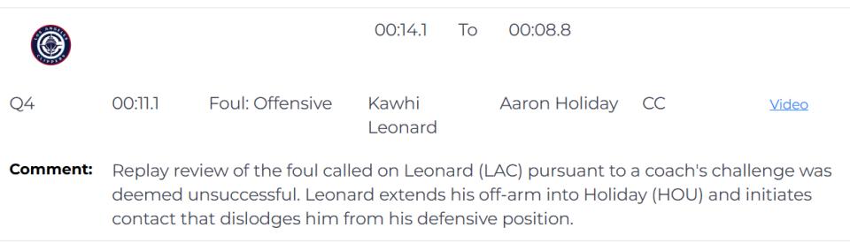 With 11.1 seconds remaining, Leonard was called for an offensive foul against Al Horford. The referee report states that after a coach’s challenge and replay review, the challenge was denied. The replay showed Leonard used his off-ball arm to push Horford, initiating contact that forced Horford out of a legal defensive stance. This was indeed an offensive foul.