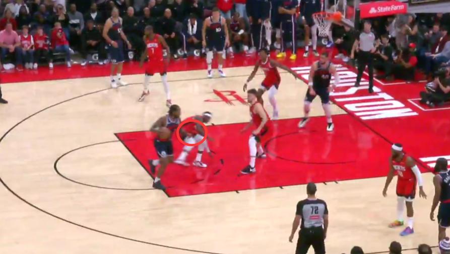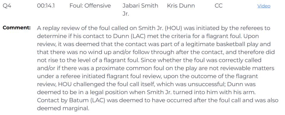It should be noted that during a referee-initiated flagrant foul review, neither the accuracy of the original foul call nor whether the foul was a regular foul are subject to review. After the flagrant foul review concluded, the Rockets challenged the original foul call itself but lost the challenge. The referees determined that when Smith Jr. turned with the ball and placed his arm on Dunn, Dunn was in a legal defensive position.