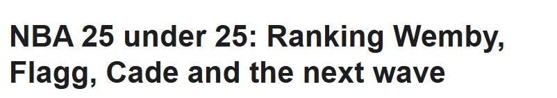 On December 13 Beijing time, ESPN announced the top 25 NBA players under the age of 25,with the selection criteria focusing on players’ long-term potential.Wembanyama of the Spurs tops the list, Edwards from the Timberwolves ranks second, and Cunningham from the Pistons is third. The Rockets have three players included: Sengun at fifth, Amen at sixth, and Shepard at twenty-fifth.