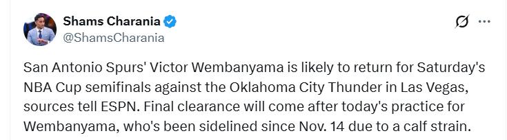 On December 13th Beijing time, according to reporter Shams, Spurs star Victor Wembanyama is anticipated to return for Sunday’s NBA Cup semifinal against the Thunder. The Spurs have officially named Wembanyama as very likely to play.