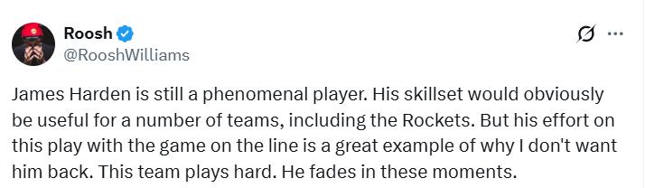 Rockets reporter Roosh Williams also commented on social media: “James Harden remains a highly talented player. His skills can clearly benefit many teams, including the Rockets. But in this game’s critical moments, his effort in that key possession perfectly illustrates why I don’t want him back — every player on this Rockets team gives their all and fights hard, yet he consistently lets the team down when it matters most.”