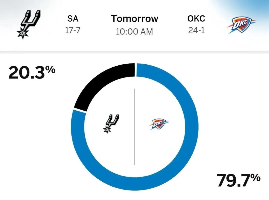 By the way, ESPN doesn’t favor the Spurs with Wembanyama to beat the nearly unbeatable Thunder. The predicted win probabilities for both teams are as follows: