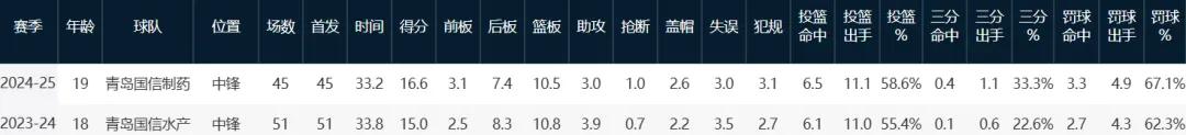 So far,Yang Hansen has played five G League games, averaging 30.8 minutes, scoring 16.2 points, grabbing 9.4 rebounds, dishing 3.8 assists, and blocking 1.2 shots per game, with shooting percentages of 50.8% overall and 31.3% from three-point range.This is roughly comparable to his stats during his time with Qingdao in the CBA.