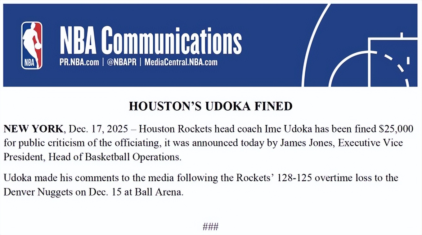 On December 18th Beijing time, the NBA released the penalty notice, fining Houston Rockets coach Udoka $25,000 due to his public criticism of the officiating following the team's narrow overtime defeat to the Denver Nuggets on Tuesday.