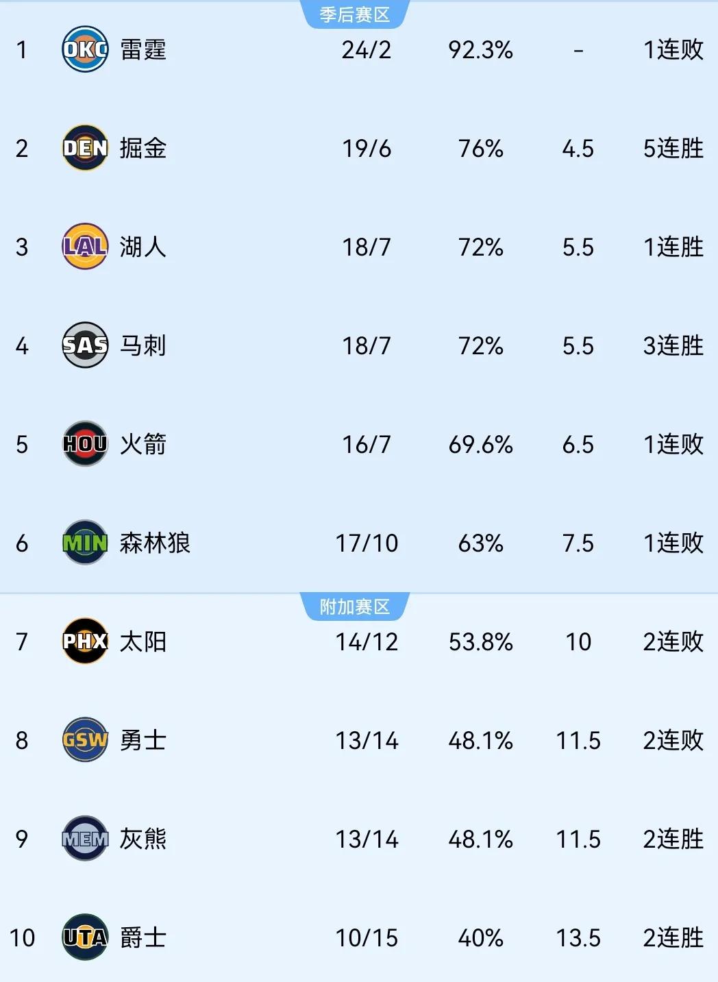 Currently, the Lakers hold an 18-7 record, sitting third in the Western Conference, one game behind the second-place Nuggets, tied with the fourth-place Spurs, and just one game ahead of the fifth-place Rockets, always at risk of dropping out of the top three.