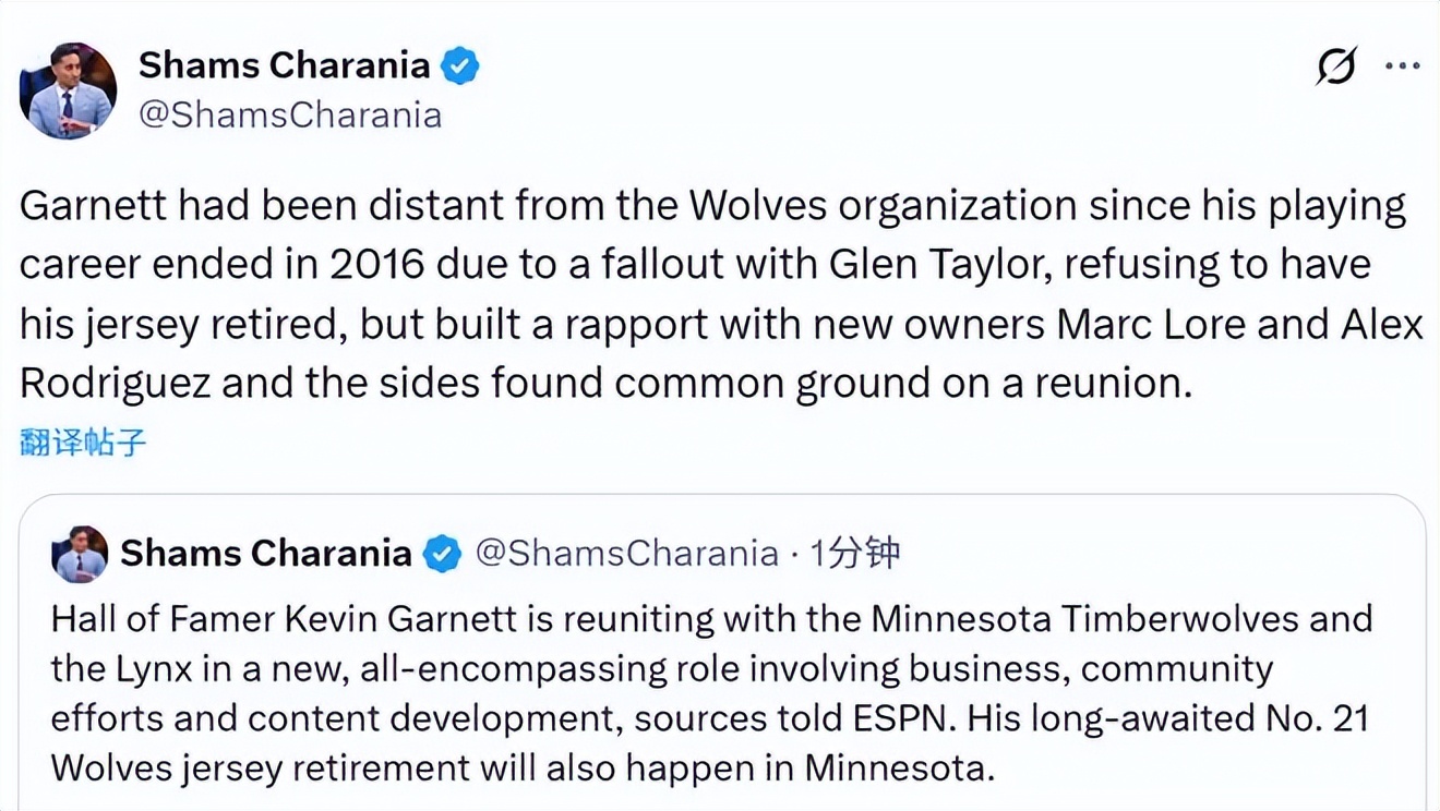 On December 18th Beijing time, according to renowned reporter Shams, ESPN sources revealed that Hall of Famer Kevin Garnett will return to the Minnesota Timberwolves and Minnesota Lynx in a new comprehensive role, overseeing business operations, community outreach, and content creation. Fans eagerly awaiting the Timberwolves’ retirement of the No. 21 jersey will see the ceremony take place locally in Minnesota.