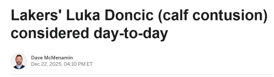 On December 23rd Beijing time, Lakers star Doncic was diagnosed with a left calf contusion. Head coach Reddick confirmed that Doncic's condition is being observed daily. Reeves and Hachimura are also on daily watch.
