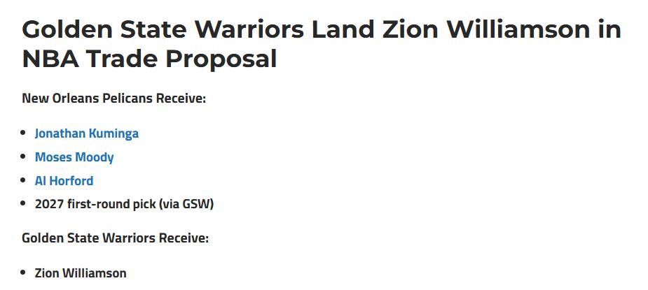 The specific proposal involves the Warriors sending Kuminga, Moody, Horford, and a 2027 first-round pick to the Pelicans in exchange for Zion. Piercey also analyzed from both sides why such a trade could happen.