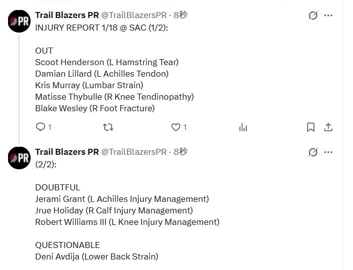 On January 19th Beijing time, the Trail Blazers released their injury update for the back-to-back game against the Kings. Grant and Robert are both expected to miss the game, and Yang Hansen is anticipated to see increased minutes. Furthermore, Avdija, previously injured, is now listed as questionable and could return. This development benefits Hansen since Avdija is a teammate who likes to pass to him.