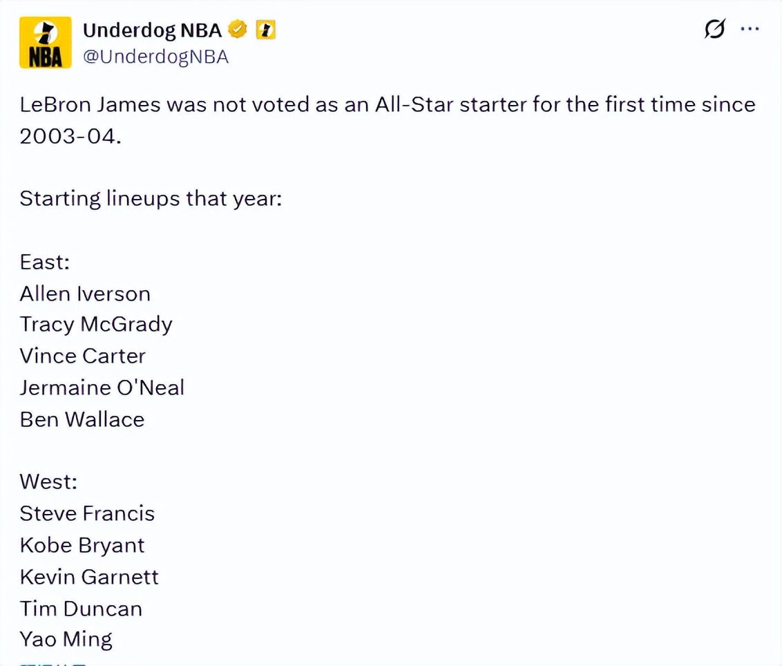 Strictly speaking, LeBron still has a chance to be selected as a reserve for the All-Star team, and he might ultimately start due to injuries or special league commemorations. Additionally, this year’s new All-Star format includes two USA teams and one World team, which increases the number of starting spots for American players. It remains unclear whether this change will affect his consecutive starting streak.