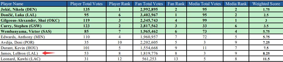 LeBron’s final fan vote count was 1,819,776, placing him 8th in the West. He received 3 media votes, ranking 9th in the West, and earned 53 player votes, ranking 8th in the West.His weighted score is 8.25, putting him 9th in total votes in the West, behind Jokic, Doncic, Alexander, Curry, Wembanyama, Edwards, Avdija, and Durant.
