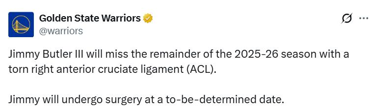 On January 21 Beijing time, the Warriors officially announced that forward Jimmy Butler suffered a right ACL tear and will be sidelined for the rest of the 2025-26 season. The injury occurred during the third quarter with 7:41 remaining in the game against the Miami Heat yesterday. The Warriors secured a 135-112 victory. Butler is scheduled for surgery soon.