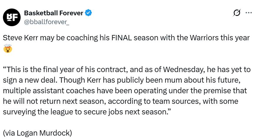 Murdock stated: "This season is the last year of his contract, and as of Wednesday local time, he has not renewed with the team. Although Kerr has remained tight-lipped about his plans, sources within the organization indicate that several assistant coaches have accepted he won’t return next season, with some already seeking new positions within the league. Last month, longtime assistant Chris DeMarco left the coaching staff to become the head coach of the WNBA’s New York Liberty."