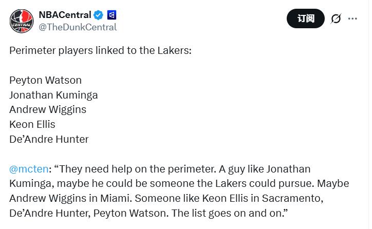"The Lakers' perimeter needs urgent improvement. Players such as Jonathan Kuminga might be pursued by the team. Andrew Wiggins from Miami is another possibility. Additionally, Keon Ellis from Sacramento, along with De'Andre Hunter and Payton Watson, are also on the shortlist. This potential recruitment list is quite extensive."