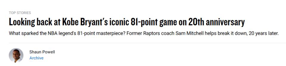 On January 23rd, 20 years ago, Kobe Bryant dropped 81 points in a game against the Raptors. The NBA's official site published a lengthy article honoring this miracle and spoke with Sam Mitchell, the opposing coach at the time. He reflected on this classic battle from the opponent’s perspective. Below is the full article from the official site—
