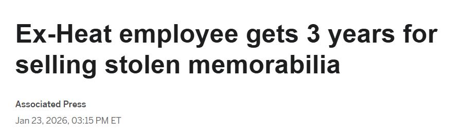On January 24th, Miami time, a former security officer of the Miami Heat was sentenced to 3 years in federal prison for stealing hundreds of players’ game-worn jerseys and other precious sports collectibles while employed, and was ordered to compensate nearly $1.9 million.