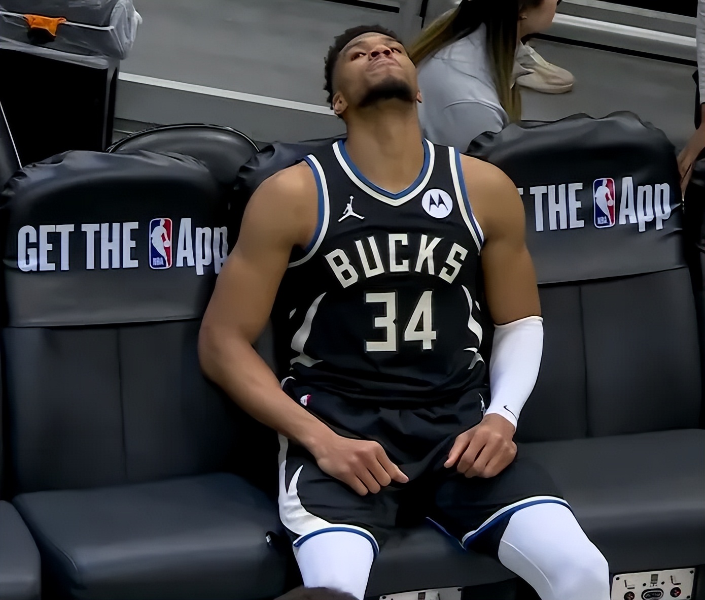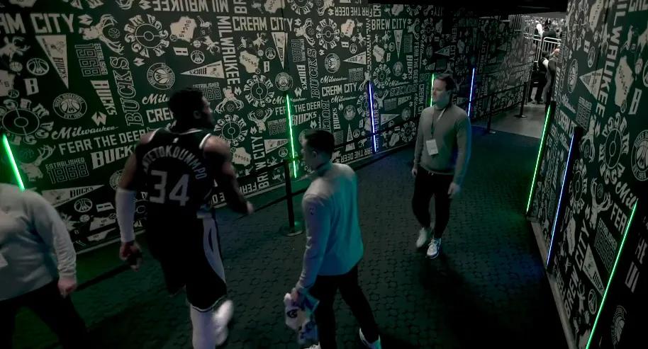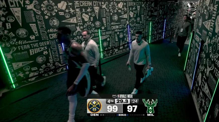 Giannis had already entered the players' tunnel heading to the locker room when Rollins hit a clutch three-pointer to keep the team alive. Hearing the crowd's cheers, Giannis turned back to the court and sat on the bench to watch the rest of the game, his calf already wrapped with a brace.