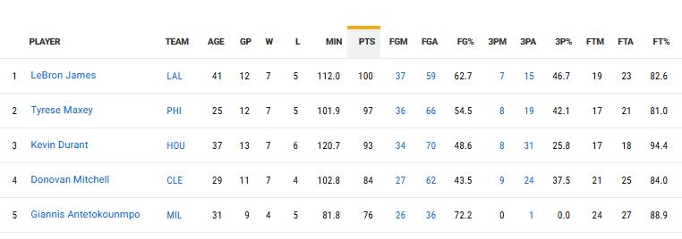 Since 2026 began, the top five players in fourth-quarter total points are LeBron James (100 points), Maxey (97 points), Durant (93 points), Mitchell (84 points), and Antetokounmpo (76 points).
