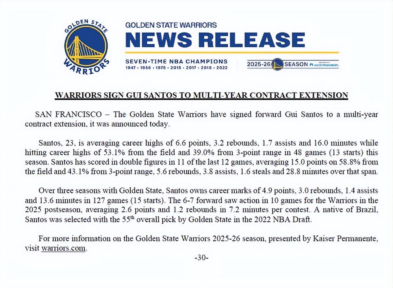 On March 1st, Beijing time, the Warriors officially announced that third-year forward Santos has signed a multi-year contract extension with the team. According to renowned reporter Shams, Santos' deal is a 3-year, $15 million extension, which includes a player option for the 2028-29 season.