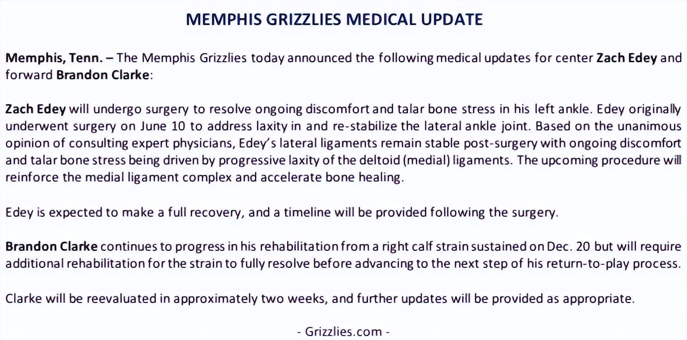 The Grizzlies stated: To address persistent discomfort in the left ankle joint and talus stress issues, Edey will undergo surgery. He initially had surgery on June 1 last year, aimed at improving lateral ankle joint laxity and restoring its stability. According to the consensus of consulting specialist physicians, Edey's lateral ligaments remained stable post-surgery, while the persistent discomfort and talus stress issues are primarily due to progressive laxity of the deltoid (medial) ligament. The upcoming surgery will reinforce the medial ligament complex and accelerate bone healing. Edey is expected to make a full recovery, with a rehabilitation timeline to be announced after the procedure.