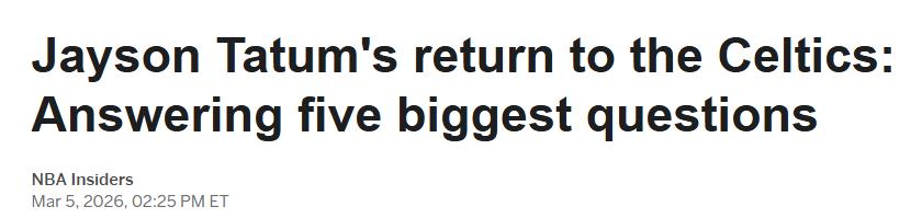 Why is Tatum choosing to return now? How will his comeback impact the championship race? And how might it alter the Celtics' offseason plans? ESPN addresses five core uncertainties surrounding the surprising return of this 2024 NBA champion.