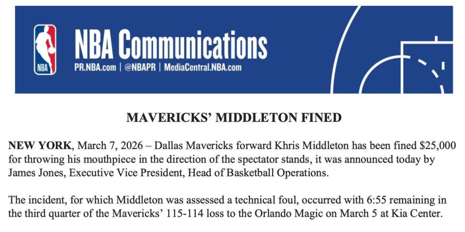 The league stated that the incident occurred during Friday's Mavericks away game against the Orlando Magic, with 6:55 remaining in the third quarter. Middleton was immediately assessed a technical foul during the game, resulting in a $2,000 fine, and today an additional $25,000 fine was imposed.