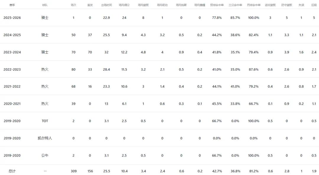 This player was born on March 28, 1996, an undrafted player from the 2019 class. He is a swingman with a height of 1.96 meters and a wingspan of 2.01 meters. Throughout his NBA career, he averages 25.5 minutes per game in regular season, contributing 10.4 points, 3.4 rebounds, and 2.4 assists, averaging 2.3 three-pointers per game with a 37% shooting rate. In playoffs, he averages 29.1 minutes per game, scoring 9.8 points, 4.2 rebounds, and 2.2 assists, averaging 2.2 three-pointers per game with a 33.9% shooting rate.