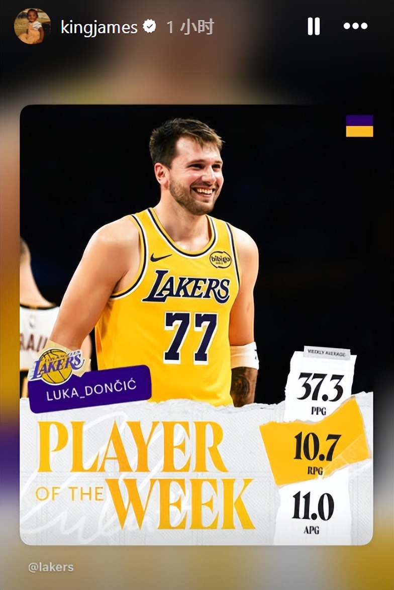 On March 17 Beijing time, Lakers star LeBron James updated his social media, posting a picture of a wound on his leg and captioning it humorously: "Ball-saving for this year is over, ouch, that hurts!" James also forwarded the poster announcing Doncic's selection as the Weekly Best player to congratulate him.