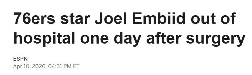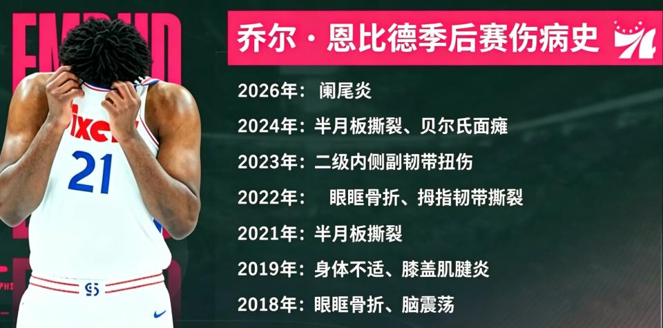 After being diagnosed with appendicitis, Embiid underwent emergency surgery yesterday. The 76ers stated that Embiid's postoperative recovery will be managed jointly by the team doctors and the surgeon. ESPN listed Embiid's playoff injury history—