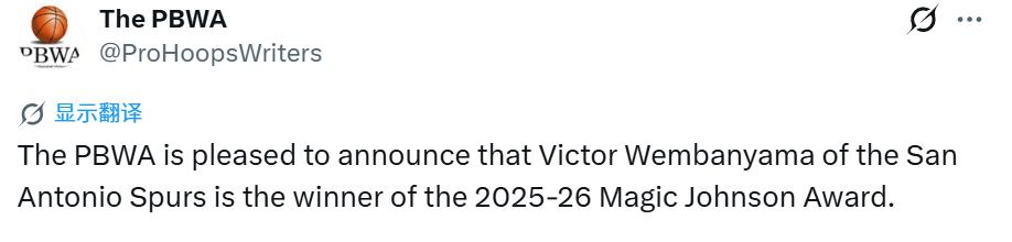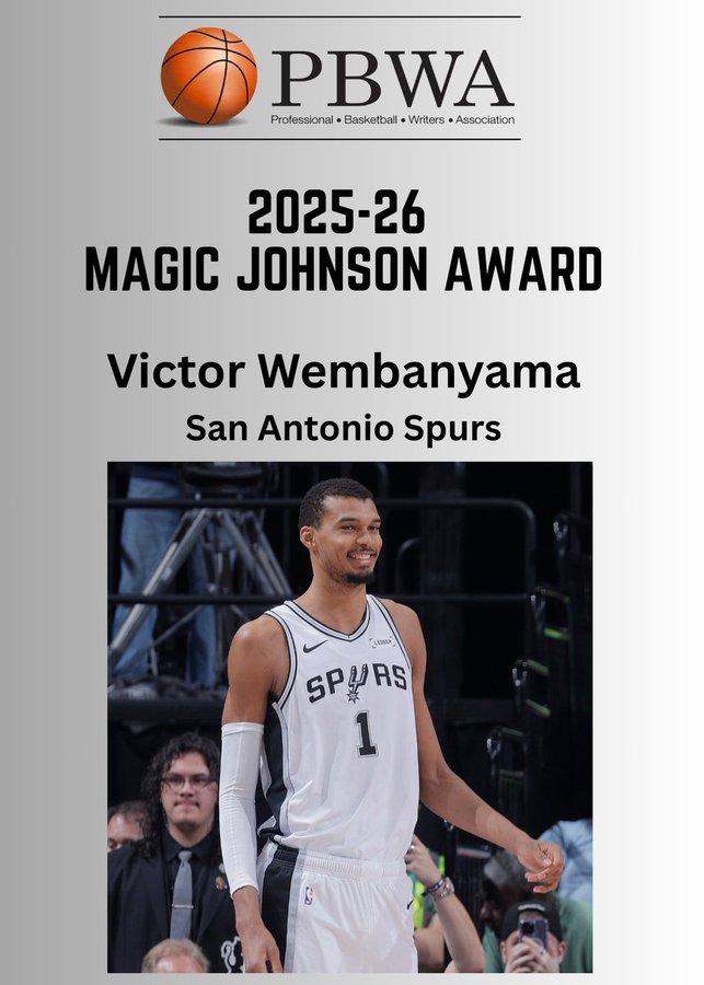 On April 17, Beijing time, the Professional Basketball Writers Association announced that San Antonio Spurs' Victor Wembanyama has won the 2025-26 season Magic Johnson Award. This award honors NBA players who excel on the court while also demonstrating cooperation and grace when interacting with media and fans.